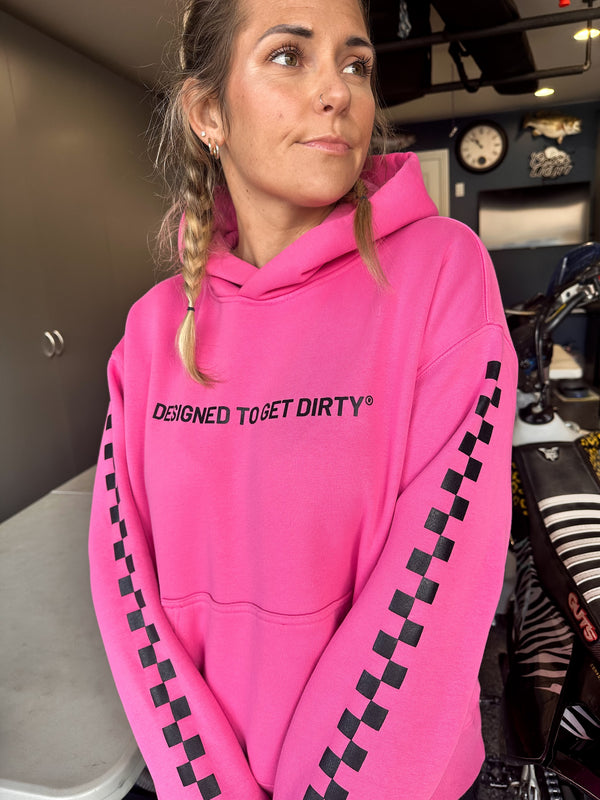 Elevate your streetwear game with the Designed to get Dirty® Pink Hoodie. This oversized sweatshirt combines bold racing aesthetics with everyday comfort, featuring eye-catching checkered sleeves for a sleek, high-speed vibe. Perfect for race fans and fashion enthusiasts alike, it’s the ultimate blend of style and comfort.